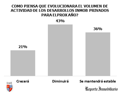 Así, con relación a las expectativas sobre la evolución del nivel de actividad de los desarrollos inmobiliarios privados, una minoría del 21 % prevé que aumentará, mientras que la mayor parte de los encuestados con un 43% piensa que disminuirá aún más.