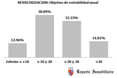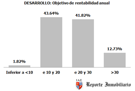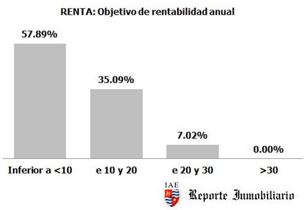 La encuesta solicitaba que los participantes indicaran cuales serían los objetivos de rentabilidad pretendidos para invertir según distintas finalidades. De las respuestas obtenidas se desprende que las mayores tasas de rendimiento se exigen a la hora de invertir en desarrollo inmobiliario, frente a la inversión con fines de revalorización y claramente por sobre la opción de renta.