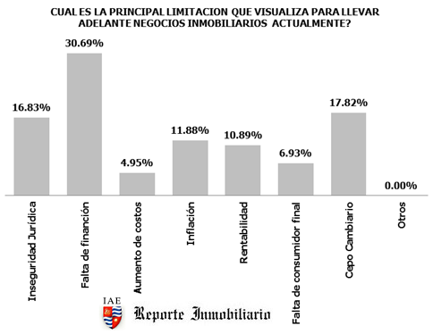 Finalmente, aunque con porcentuales más distribuidos, la falta de financiación fue vista por el mayor número de participantes de la encuesta como la principal limitación actual para llevar adelante negocios inmobiliarios. El cepo cambiario figuró en segundo lugar a la hora de juzgar la causa que limita la actividad del real estate local.