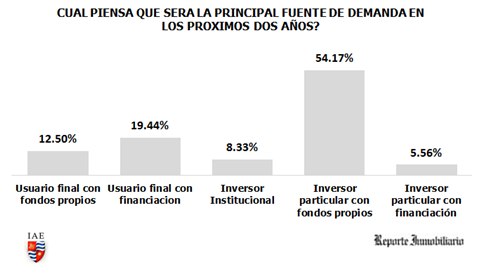 Volviendo al presente, la mayoría considera que la demanda seguirá proviniendo del “inversor particular con fondos propios”, mientras que lejos, con cerca de un 20 % de las respuestas se tiene esperanzas en la aparicióndel usuario final con financiación como principal fuente de demanda.