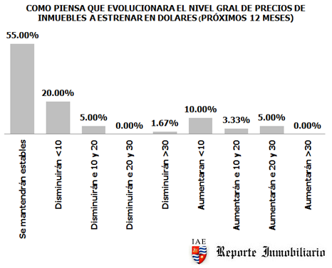 Con respecto al nivel general de precios de los inmuebles usados en dólares para el próximo año, la tendencia predominante que proyectan los empresarios es hacia la estabilidad de los valores en los niveles actuales o reducción de hasta un 10 %, ya que en conjunto suman casi el 70 % de las respuestas (69,35 % exactamente). Poco más de un 19 % considera que los precios ajustarán a la baja en un porcentaje comprendido entre el 10 y 20 %.