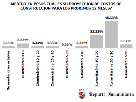 En este caso, el 48,33 % opinó que los costos de construcción para los próximos 12 meses aumentarán entre el 20 y el 30 %, respuesta que está en línea con los índices de incremento de los costos de construcción para los útimos años medidos por la Cámara Argentina de la Construcción.