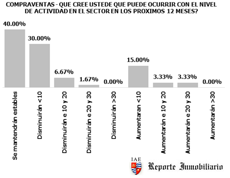 En cuanto a la cantidad de compraventas de inmuebles, la mayoría opina que seguirá en niveles similares a los actuales el próximo año, incluso un 30 % cree que caerá aún más aunque en porcentajes inferiores al 10 %. Un 15 % considerá que habrá más compraventas y que el nivel de actividad subirá hasta un 10 %. No obstante, predominan en conjunto las proyecciones de que el número de operaciones se mantendrá estable o se reducirá aún más con un 78,34 frente al 21,66 que opina que aumentará.