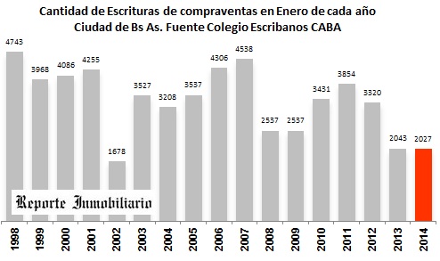Con los datos de enero dados a conocer por el Colegio de Escribanos de la ciudad de Buenos Aires, se alarga a 26 meses consecutivos la racha negativa de caída interanual de escrituras de compraventa inmobiliaria.
