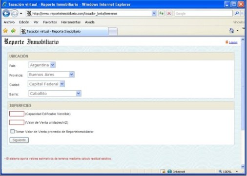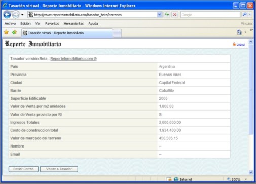 Con el fin de facilitar este cálculo, Reporte Inmobiliario implementó un sistema on-line mediante el cual a partir del ingreso de determinados datos se puede hallar en forma sencilla el valor de un terreno de acuerdo al método residual ya que el sistema aplica la fórmula de manera automática.Seleccionando la opción terrenos y la localidad se le presentarán sucesivas pantallas donde Ud. podrá ingresar sus propios datos o bien optar por utilizar los provistos en forma automática por Reporte Inmobiliario.