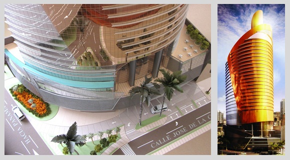Detalle de la maqueta y Render exterior del Hotel Las Americas Golden Tower
