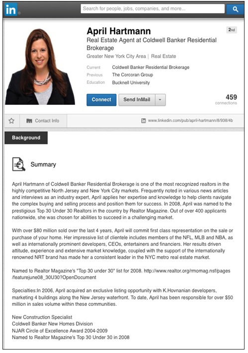 Conviene utilizar el resumen para describir por qué la gente debería elegir trabajar con uno, incluyendo cualquier experiencia específica o especialización como por ejemplo, el hecho de que uno se especializa en los compradores de vivienda por primera vez o en alquileres o en inversiones.