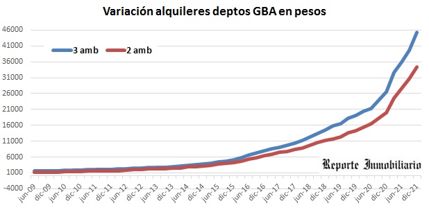 El valor locativo mensual promedio de la oferta de las 13 localidades analizadas en forma trimestral por Reporte Inmobiliario desde junio del 2009 superó al cierre del año 2021 los $ 45 mil para un departamento usado standard de dos dormitorios mientras que una unidad de dos ambientes cotizaba en promedio a casi $ 34.500 mensuales.