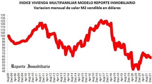 El costo promedio de los últimos tres años (enero 2019-enero2022), es un 40 % inferior al de los tres años anteriores (enero 2016-enero2019). Mientras que entre 2016 y 2019 el promedio superó los mil dólares por m2