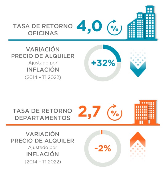 Para realizar la comparación, en el caso de las oficinas se tomó el valor promedio de alquiler solicitado en el mercado CBD (zona céntrica) compuesto por los submercados 9 de Julio, Catalinas-Plaza Roma, Centro Sur, Microcentro, Puerto Madero y Retiro-Plaza San Martín, en tanto que para el mercado residencial se utilizó como referencia el valor promedio de tres zonas: Barrio Norte, Belgrano y Palermo para departamentos usados de 2/3 ambientes estándar sin amenities. En ambos casos, los datos (correspondientes al período 2014-Q1 2022) fueron ajustados por inflación al cierre del primer trimestre de 2022.