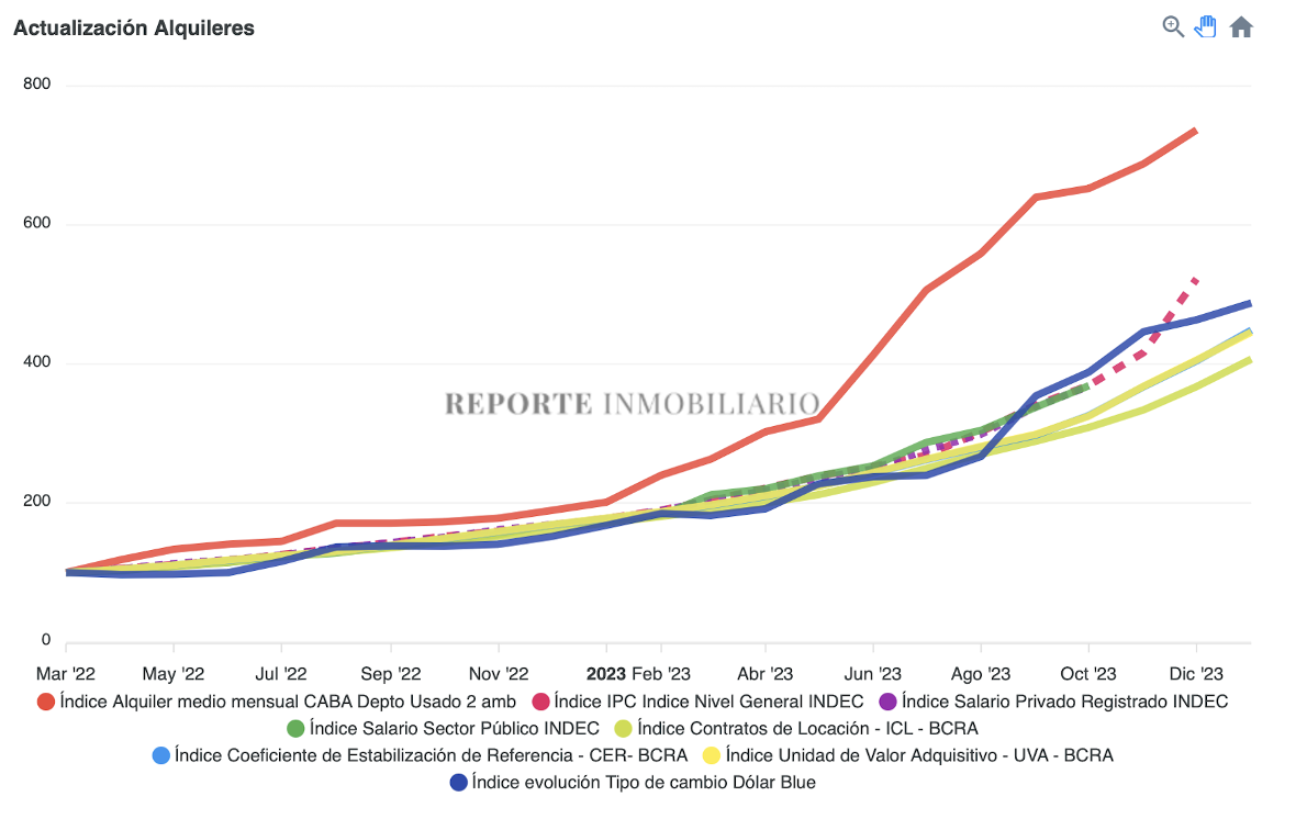 A los fines de servir de guía para la selección del mecanismo de ajuste y analizar la evolución de los índices, Reporte Inmobiliario incorpora a su sección “Indices” con periodicidad y actualización mensual los mencionados más arriba, junto con la evolución del tipo de cambio (dólar blue) y del valor medio de oferta de departamentos de 2 ambientes en CABA.