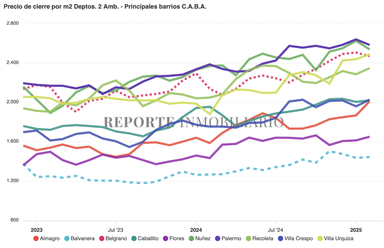 Al desglosar por cantidad de ambientes, en las compraventas de monoambientes se registró un precio de cierre por m2 de 2.223 dólares, mientras que el valor de concreción de las unidades de 2 y 3 ambientes fue de 2.118 U$S/m2 y de 2.075 U$S/m2 respectivamente