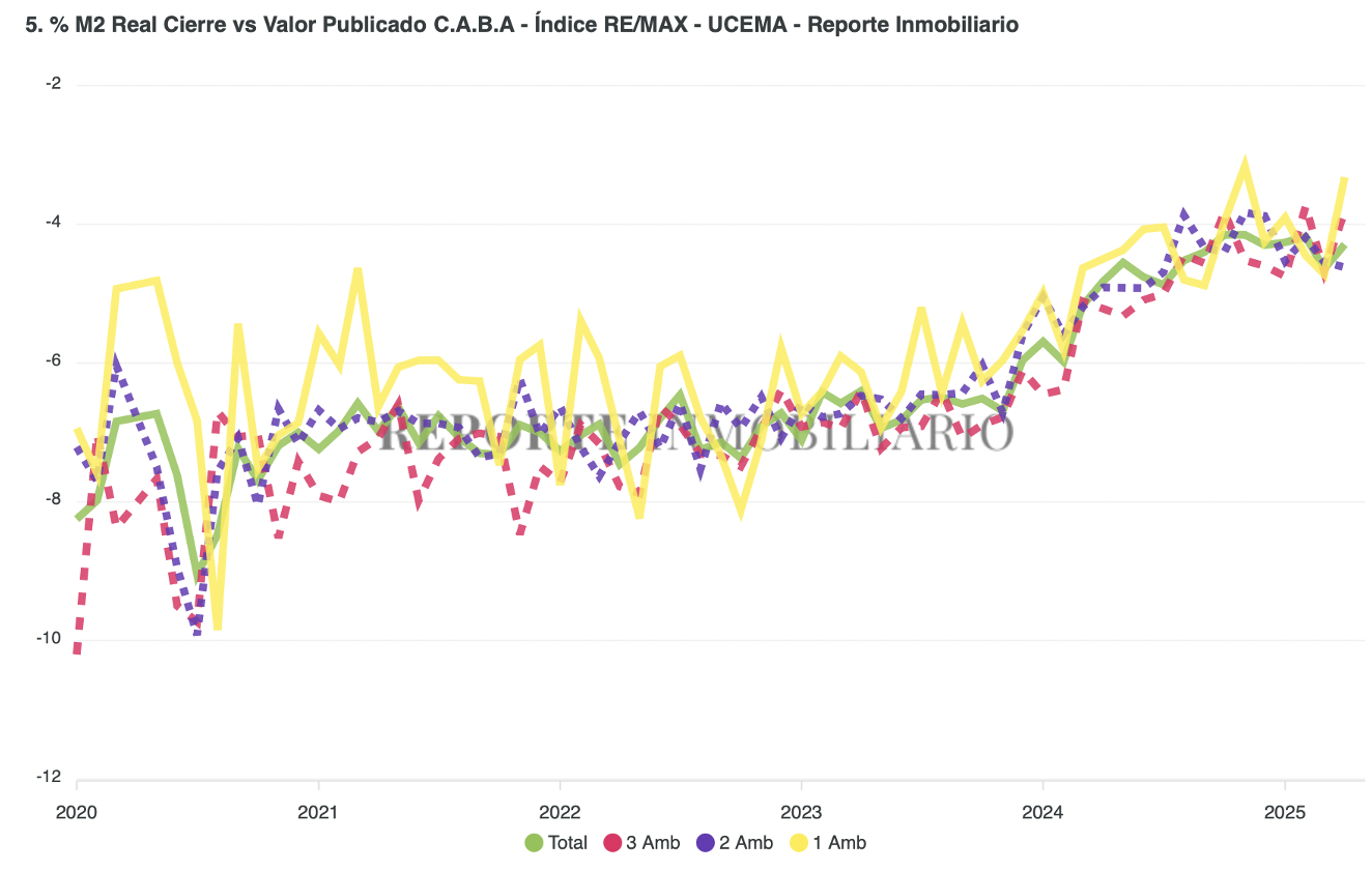 La variación en el valor del metro cuadrado también puede observarse al desagregar por cantidad de ambientes. En abril, los monoambientes registraron un precio promedio de cierre de 2.154 U$S/m², seguidos por los departamentos de dos ambientes con 2.105 U$S/m², y finalmente las unidades de tres ambientes con 2.007 U$S/m². Esta estructura refleja la tendencia habitual del mercado: a menor superficie total, mayor valor por metro cuadrado.