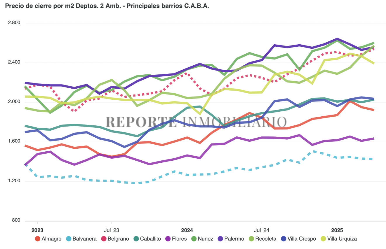 En abril, el precio promedio del metro cuadrado real se ubicó en 2.078 dólares estadounidenses. Comparado con abril de 2024, esto representa una apreciación interanual del 13,2 %, lo que refleja una recuperación sostenida del mercado. Sin embargo, si se lo compara con el valor registrado en enero de 2020 —cuando comenzó la serie histórica—, el precio actual aún se encuentra un 4,85 % por debajo, evidenciando el largo ciclo de ajuste que atravesó el sector.