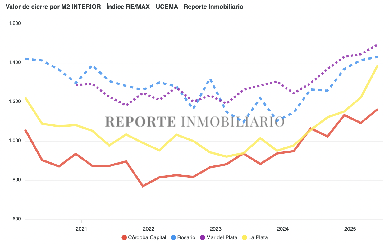 El valor real del metro cuadrado en cada una de las principales ciudades del interior —Córdoba, Rosario, La Plata y Mar del Plata— se calcula a partir de los precios efectivos de cierre de operaciones concretadas por la red RE/MAX Argentina. A partir de esa base transaccional, se genera una extensión del Índice de Precios Reales, elaborado en forma conjunta por UCEMA y Reporte Inmobiliario.