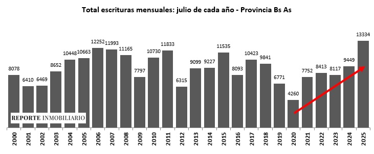 Según las estadísticas elaboradas por el Colegio de Escribanos de la Provincia de Buenos Aires, durante el séptimo mes del año se registraron 13.334 compraventas, lo que representa un aumento del 41 % interanual frente a las 9449 realizadas en julio de 2024.