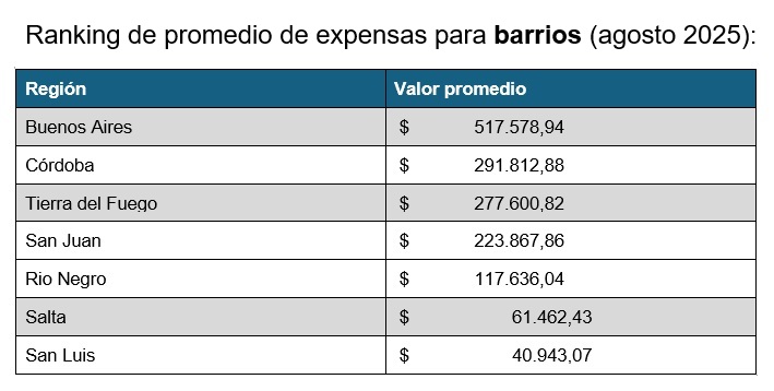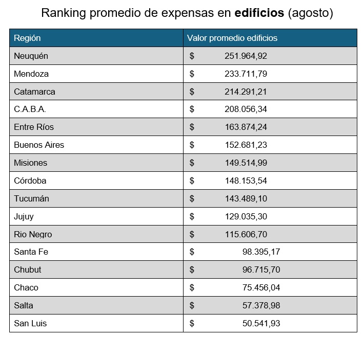Con un promedio de $251.964,92 mensuales, Neuquén es la provincia con las expensas más altas en edificios durante el mes de agosto. En segundo lugar aparece Mendoza, con un promedio de $233.711,79, mientras que la Ciudad de Buenos Aires es la cuarta más alta, promediando los $208.056,34 el último mes.