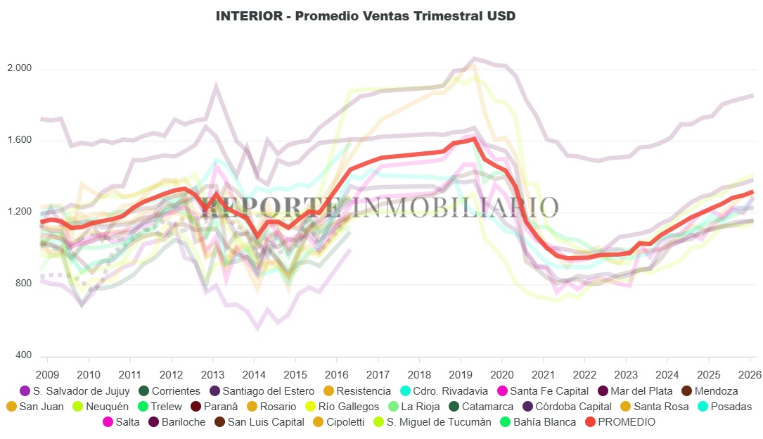 La sección incluye valores inmobiliarios de VENTA promedio por m2 en dólares de departamentos usados de 2-3 ambientes de calidad standard sin amenities en las principales ciudades del interior del país (2003 al 2014 anual – desde Oct 2008 trimestral hasta mayo 2016). Rangos mínimos y máximos para cada plaza. LOCALIDADES CUBIERTAS: Bariloche, Neuquen, Santa Rosa, Río Gallegos, Comodoro Rivadavia, Paraná, Salta Capital, Cipolletti, Mar del Plata, Mendoza Capital, Córdoba Capital, Rosario, Posadas, Corrientes, Trelew, Santa Fé Capital, San Luis Capital, San M de Tucumán, San Salv. de Jujuy, San Juan Capital, S. del Estero, Resistencia, La Rioja Capital y S F del V Catamarca. Actualización trimestral. EMPALME DESDE 2016 A LA FECHA para Bahía Blanca, Bariloche, Cordoba Cap, Mar del Plata, Mendoza Cap, Neuquen Cap, Posadas, Rosario, Salta Cap, Santa Fé Cap y San Miguel de Tucuman. Se incluye posibilidad de bajar archivo Excel o de utilizar la nueva gráfica interactiva